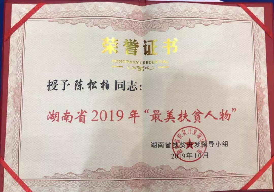 因为各种善行义举,他先后荣获全国汶川大地震抗震救灾先进个人、廊坊市劳动模范、平江县“引老乡、建家乡”活动突出贡献青年企业家、“全国模范退役军人”等荣誉。 此次陈松柏董事长荣获湖南省2019年“百名最美扶贫人物”称号,这既是对他大爱精神的肯定和鼓励,也是中唯建设和全体中唯人的荣耀。